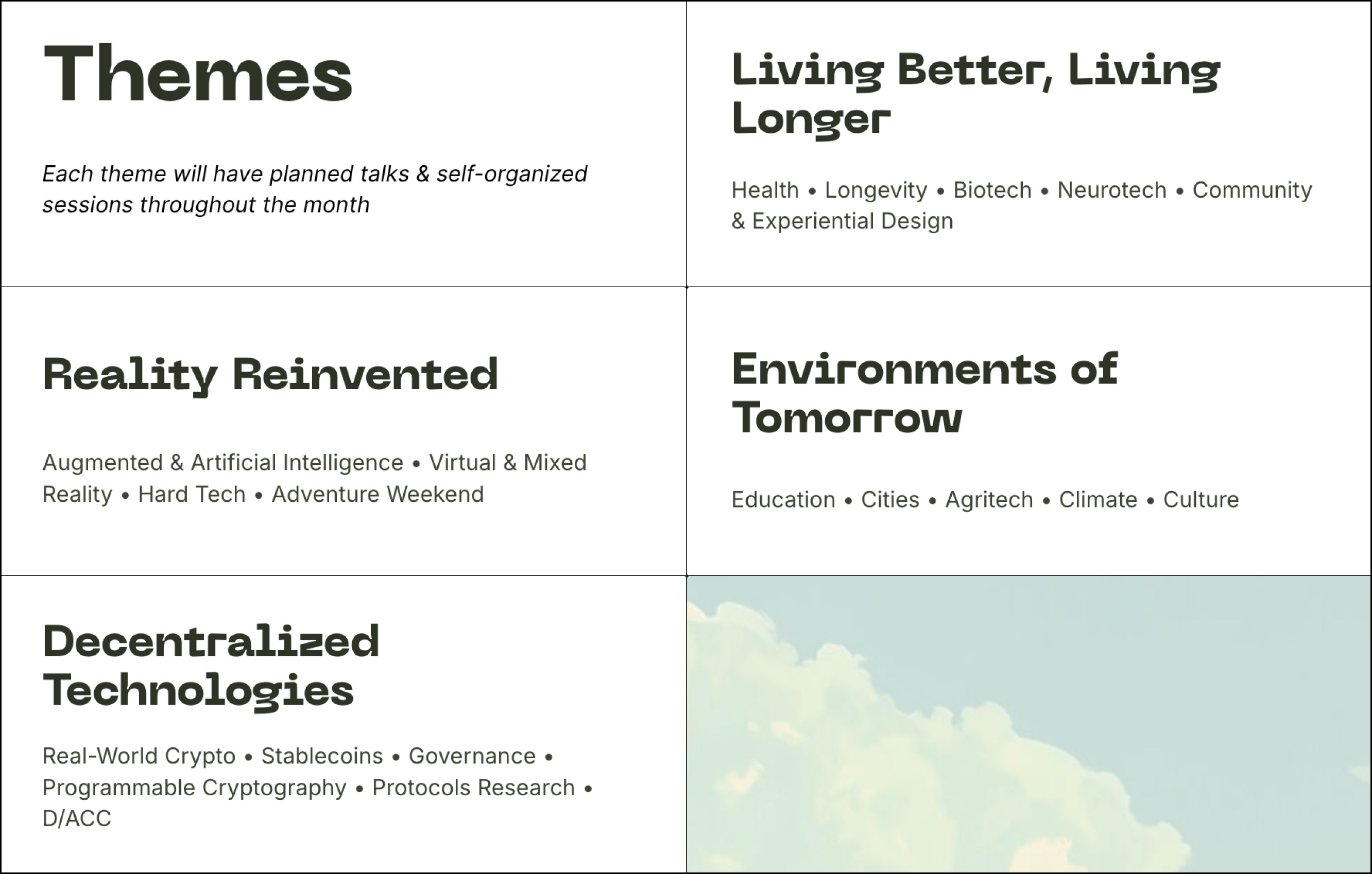 Virtual & Mixed Reality, Hard Tech, Augmented & Artificial Intelligence, D/ACC, Community & Experiential Design, and Adventure Weekend